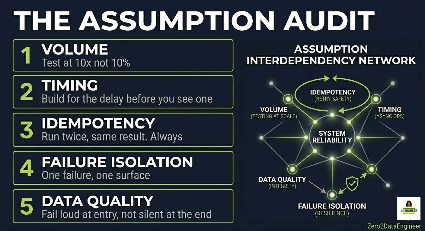 After years of building at scale, I now run every pipeline through five assumption categories before it goes live. Not because I am paranoid. Because every incident I have ever been part of traced back to exactly one of these five.