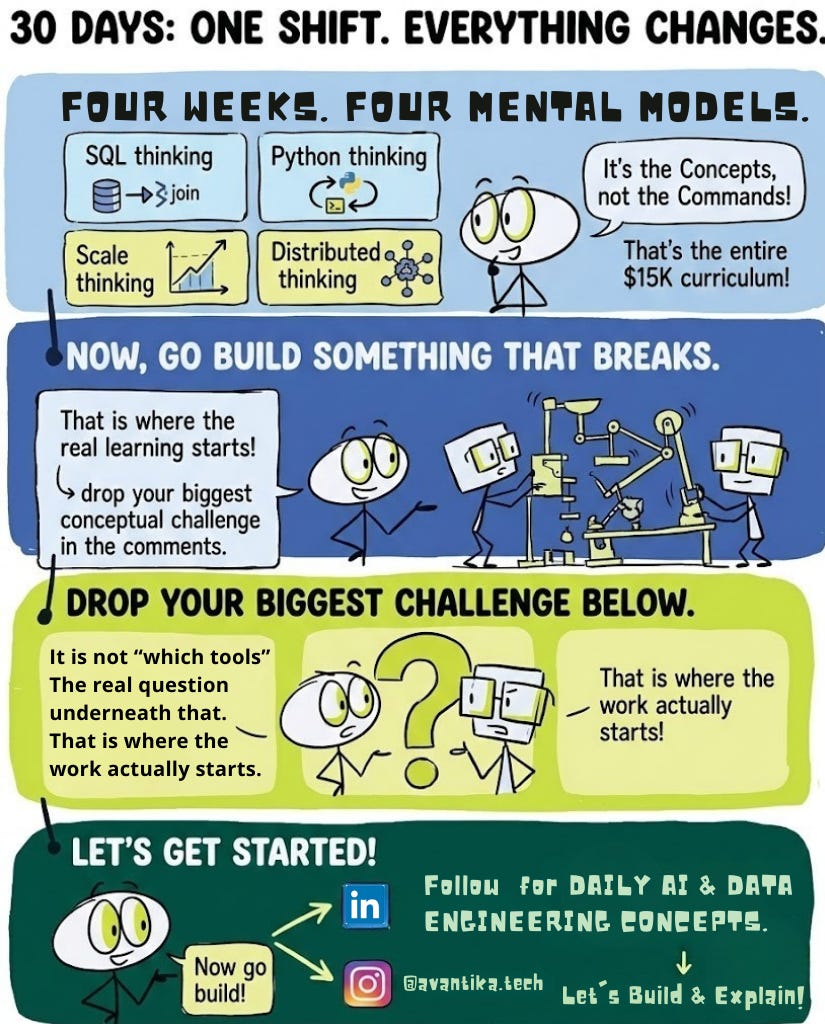 Four mental models. SQL thinking, Python thinking, scale thinking, distributed thinking. That is the entire curriculum of a $15K bootcamp. You just got it in 30 days by understanding the concepts not memorizing the commands.