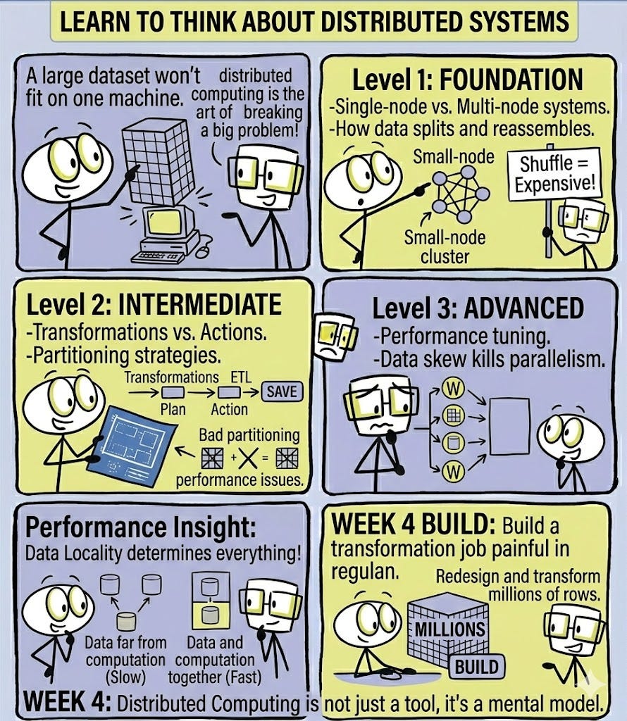 Level 1: Foundation Why distributed computing exists and what problems it actually solves. The difference between a single-node and a multi-node system. How data gets split across machines and reassembled. What a shuffle is and why it is the most expensive operation in distributed computing.