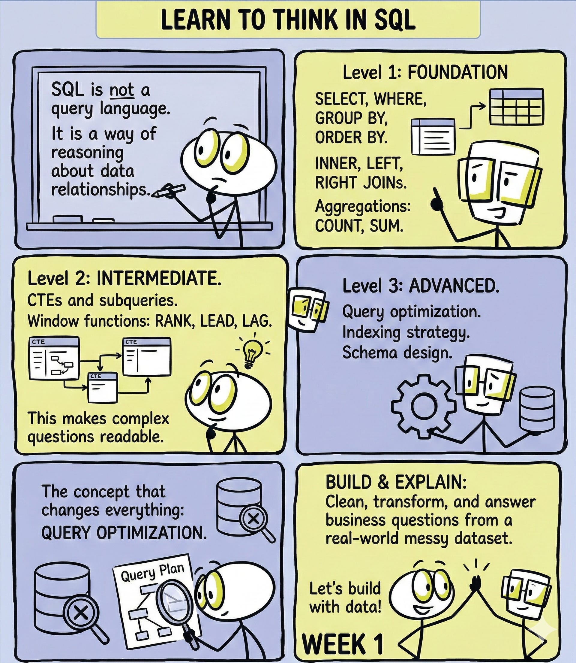 What to build: take one messy real-world dataset, something with missing values, duplicates, and inconsistent formats, and write SQL that cleans it, transforms it, and answers three business questions from it. Do not move on until you can explain every line of code out loud.