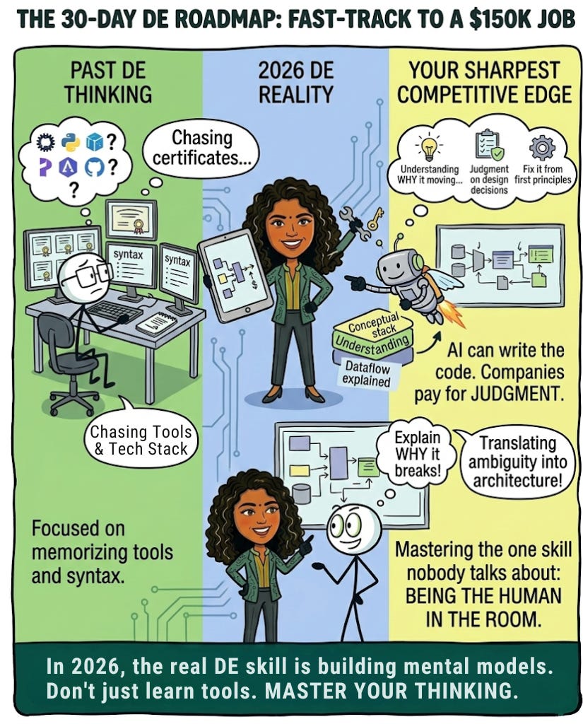Because honestly, when AI can write the code in seconds, memorizing syntax is no longer your competitive advantage. What AI cannot do is understand why a pipeline is failing at 3am, make a judgment call on a schema design that has to last five years, or walk into a broken system and reason through it from first principles. That is what companies are paying $150K for in 2026. Not your ability to remember a function name. Your ability to think.